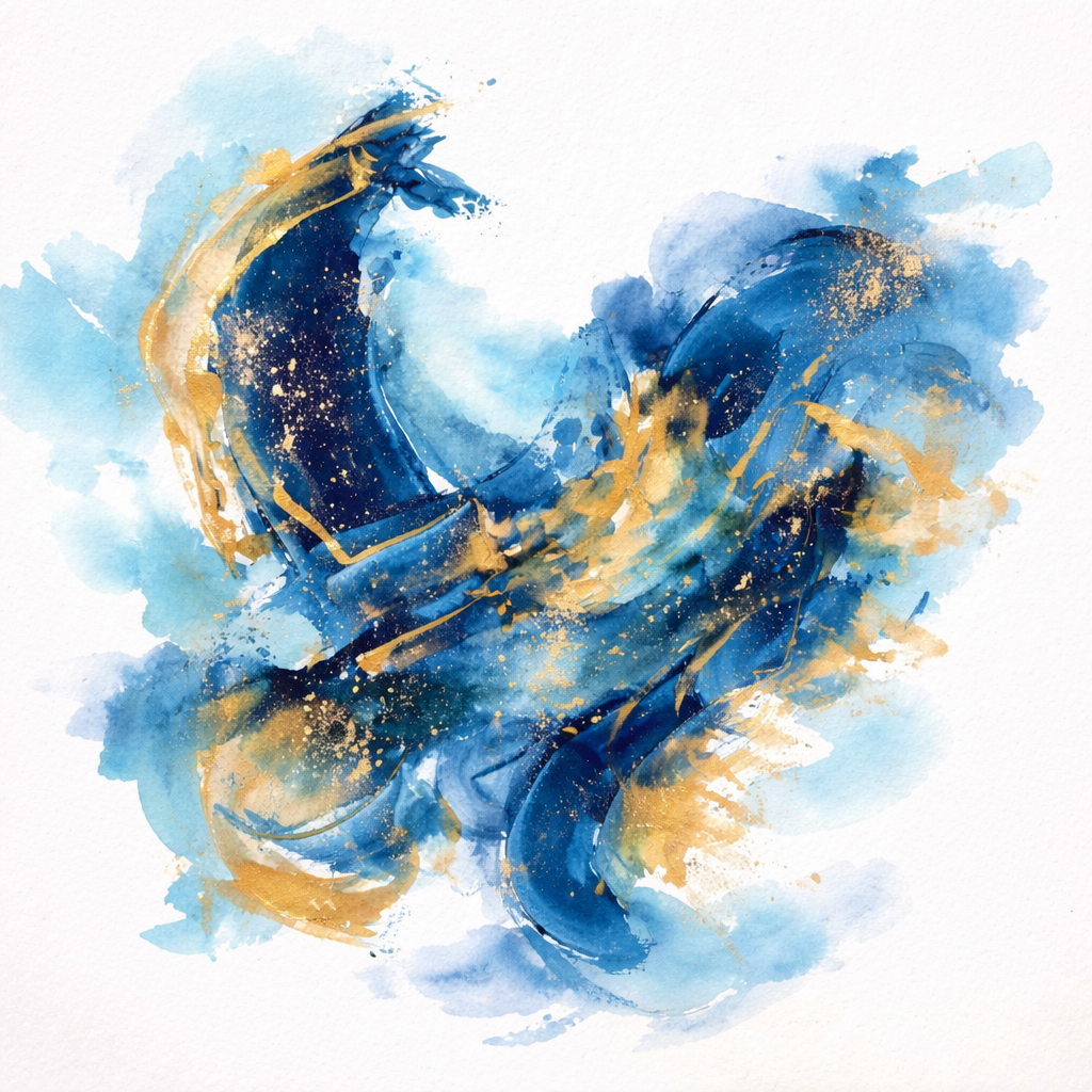 لوحة تجريدية نابضة بالحياة بضربات فرشاة ديناميكية باللون الأزرق والذهبي، تستحضر سيولة وعمق أمواج المحيط.