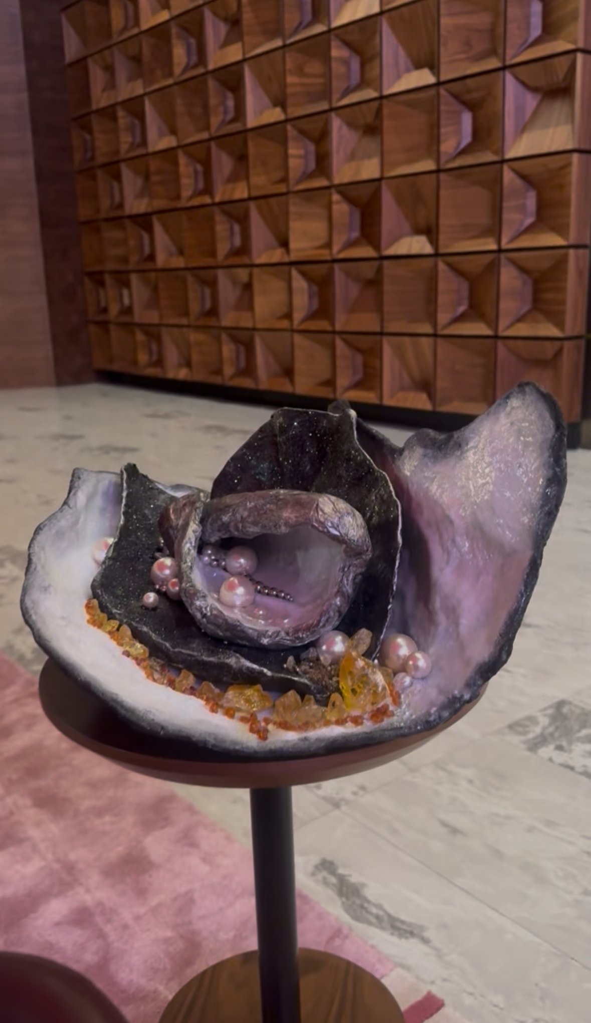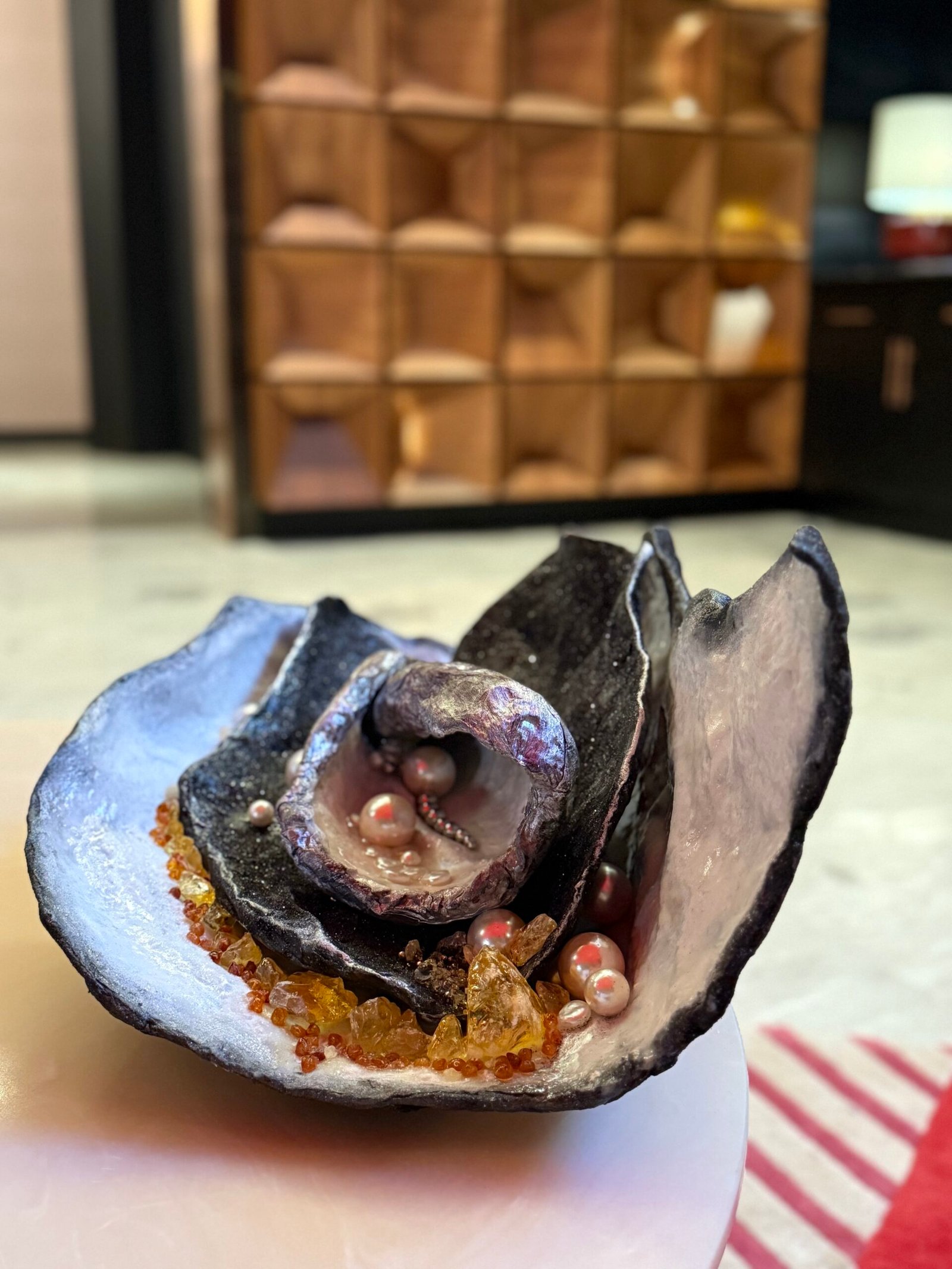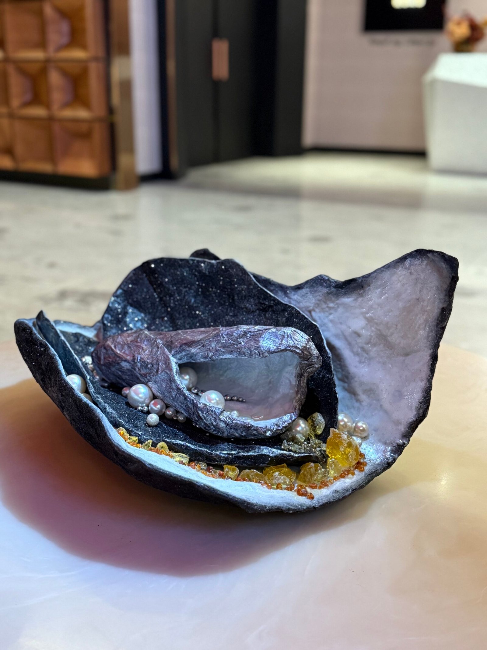 منحوتة فريدة من نوعها. بدمج لآلئ الخليج العربي وكهرمان بحر البلطيق، تجمع هذه القطعة رمزين شكلهما الزمن والطبيعة والمرونة.