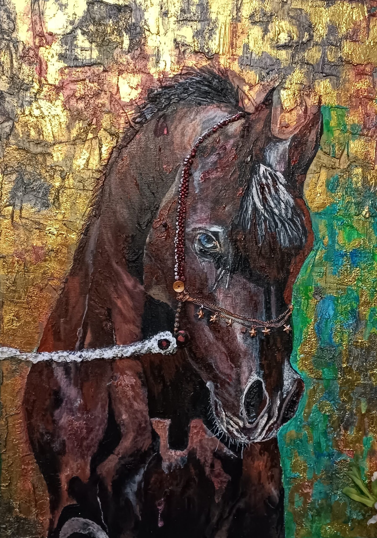 "الحصان" هو تصوير مذهل لحصان أسود قوي، تم تقديمه بتفاصيل معقدة وطبقات محكمة تجعل شخصية الحيوان الرشيقة والقوية تنبض بالحياة. يتناقض معطف الحصان الداكن العميق بشكل جميل مع الخلفية الخضراء والبيضاء الناعمة، مما يخلق تفاعلًا ديناميكيًا بين الضوء والظل. يضيف اللجام المفصل والإبرازات الدقيقة على جسم الحصان العضلي العمق والواقعية، بينما تستحضر ضربات الفرشاة المحكمة إحساسًا بالحركة والطاقة. تجسد هذه القطعة جوهر قوة الحصان وأناقته وروحه النبيلة، وتقدم احتفالًا بصريًا آسرًا بأحد أكثر مخلوقات الطبيعة روعة.