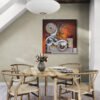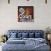 يمزج هذا العمل الفني الخطي الآسر بين التراث والتعبير الفني الحديث، متألقًا بفن الخط العربي المتقن المتشابك مع الأشكال الهندسية والتفاصيل المزخرفة. ينضح العمل بالحركة والعمق، حيث تستحضر حروفه الدوامة وزخارفه الدائرية إحساسًا بالتناغم السماوي. وتعزز لوحة الألوان الغنية والدافئة من البني الترابي والبرتقالي الناري والأسود الداكن جوهر العمل الفني الخالد والروحي. إن امتزاج الخط الكلاسيكي بالعناصر التجريدية يجعل هذه القطعة تمثيلًا رائعًا للتراث الثقافي والإبداع الفني.