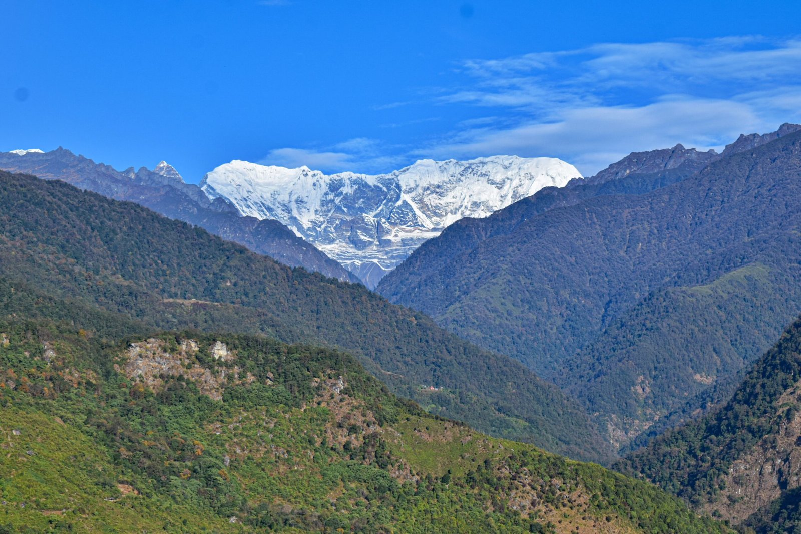صورة مذهلة تلتقط طبقات متباينة من التلال الخضراء وقمم جبال الهيمالايا المغطاة بالثلوج تحت سماء زرقاء مشرقة.
