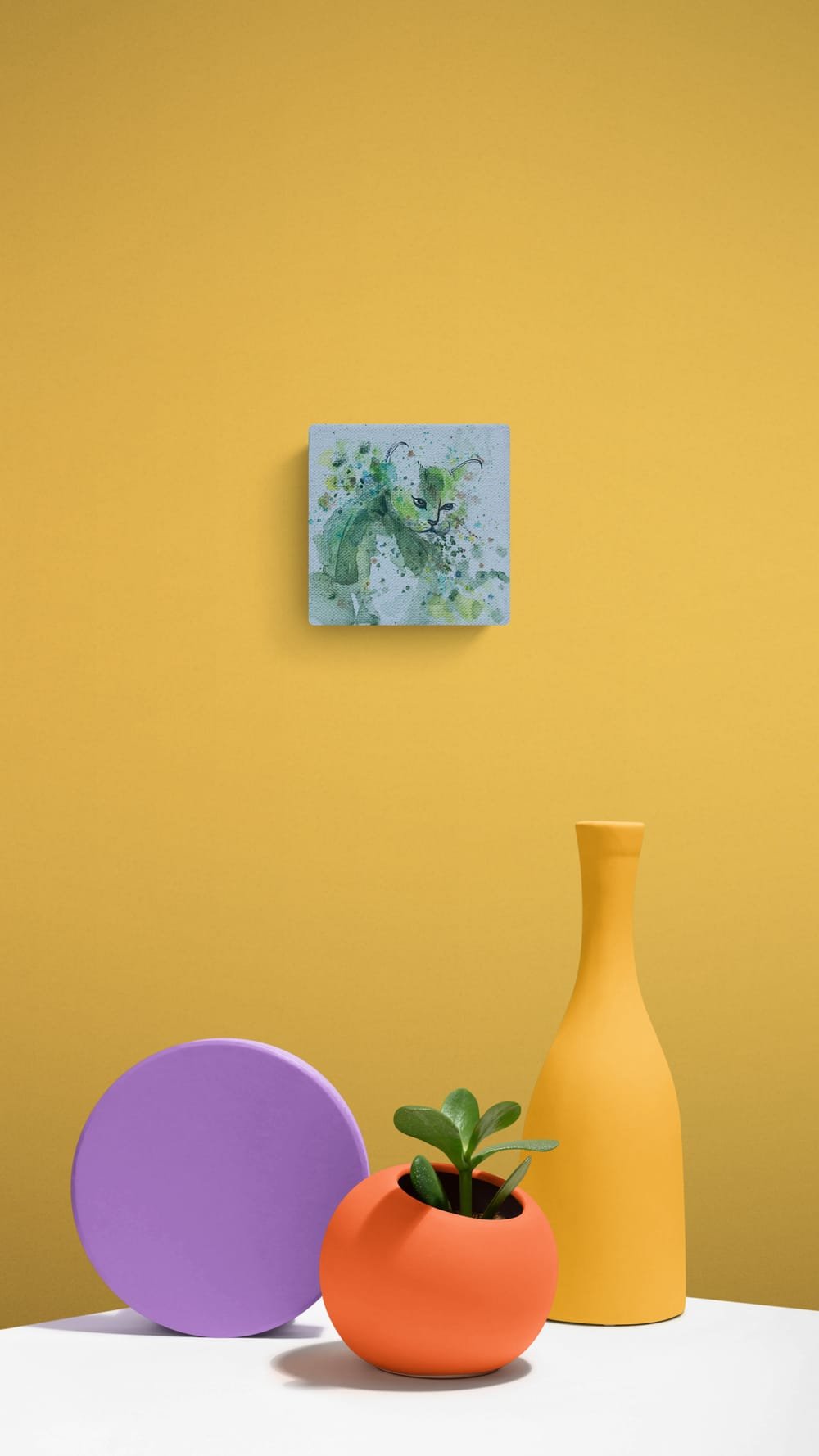 تدمج هذه القطعة الرائعة بين أناقة القطط والتدفق العضوي للطبيعة. تم تحديد شكل القطة بدقة بدرجات اللون الأخضر الشفافة، وتمتزج بسلاسة مع نسيج محيط من البقع المتناثرة والأنسجة النباتية. تشير التفاصيل المجردة إلى ارتباط عميق بالعالم الطبيعي، كما لو كان المخلوق جزءًا من بيئته ويخرج منها. يشع العمل الفني بالانسجام والغموض، ويجسد جوهر الروح البرية.