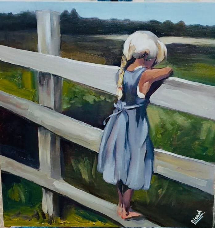فتاة صغيرة بضفائرها الشقراء المشمسة، تستند بتفكير إلى سياج خشبي أبيض، تتأمل مرجًا أخضرًا مفتوحًا يغمره ضوء النهار الدافئ. يتمايل فستانها الأزرق الناعم مع النسيم، عاكسًا حركة العشب الرقيقة خلفه. تستحضر هذه التركيبة شعورًا بالسلام والبساطة وأحلام الطفولة - تحية هادئة للطبيعة والبراءة.