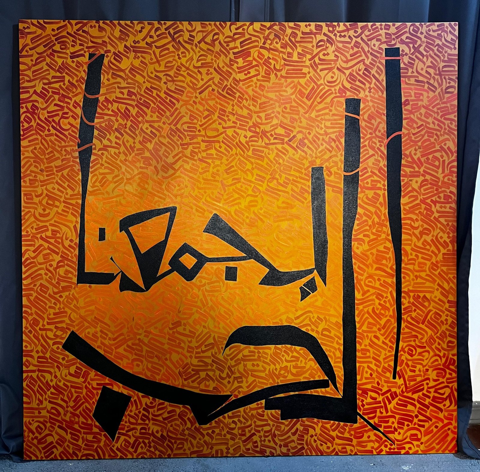 برتقالي وبني فاتح، على خلفية تشبه المرأة النبيلة، ضربات أكبر مع العبارة العربية المعطاة الحب يجمعنا، وسط أسفل وسط، يمكن أن تكون الكلمات سوداء أو بنية داكنة، أيهما يتباين بشكل جيد، حجم الصورة 150×100 سم.