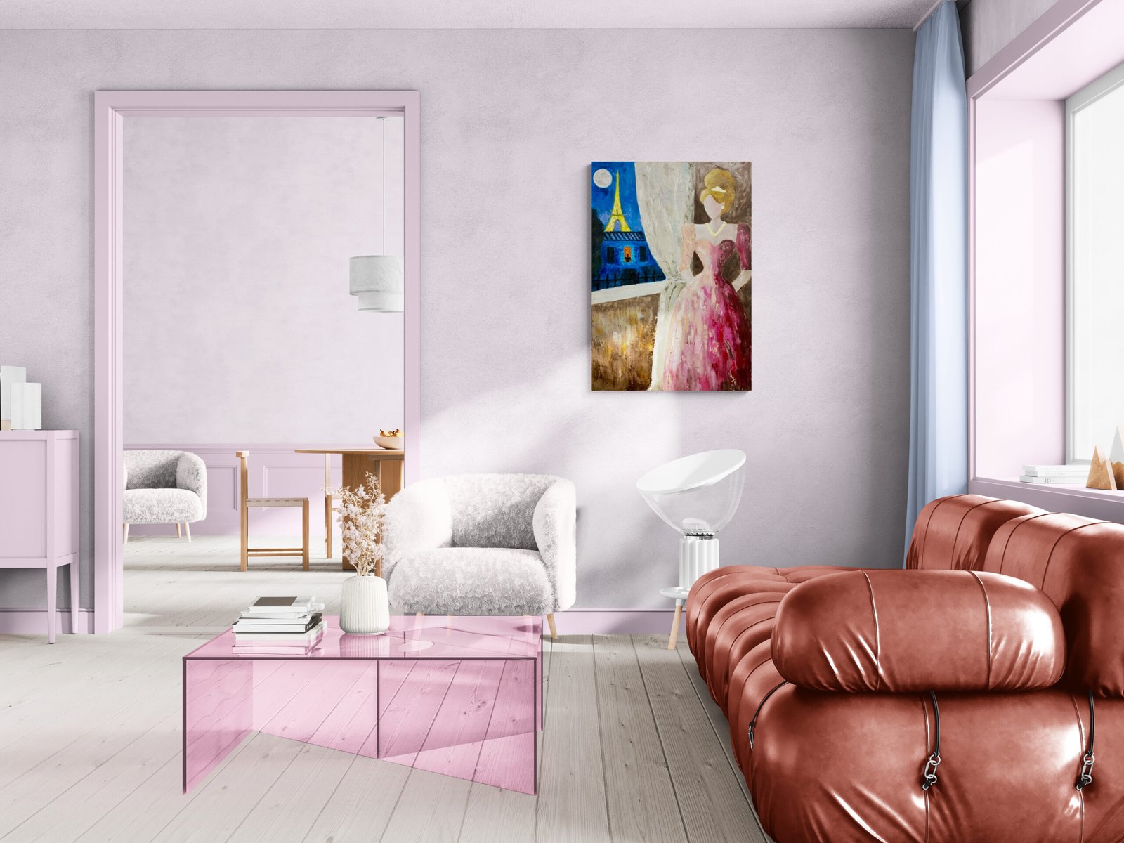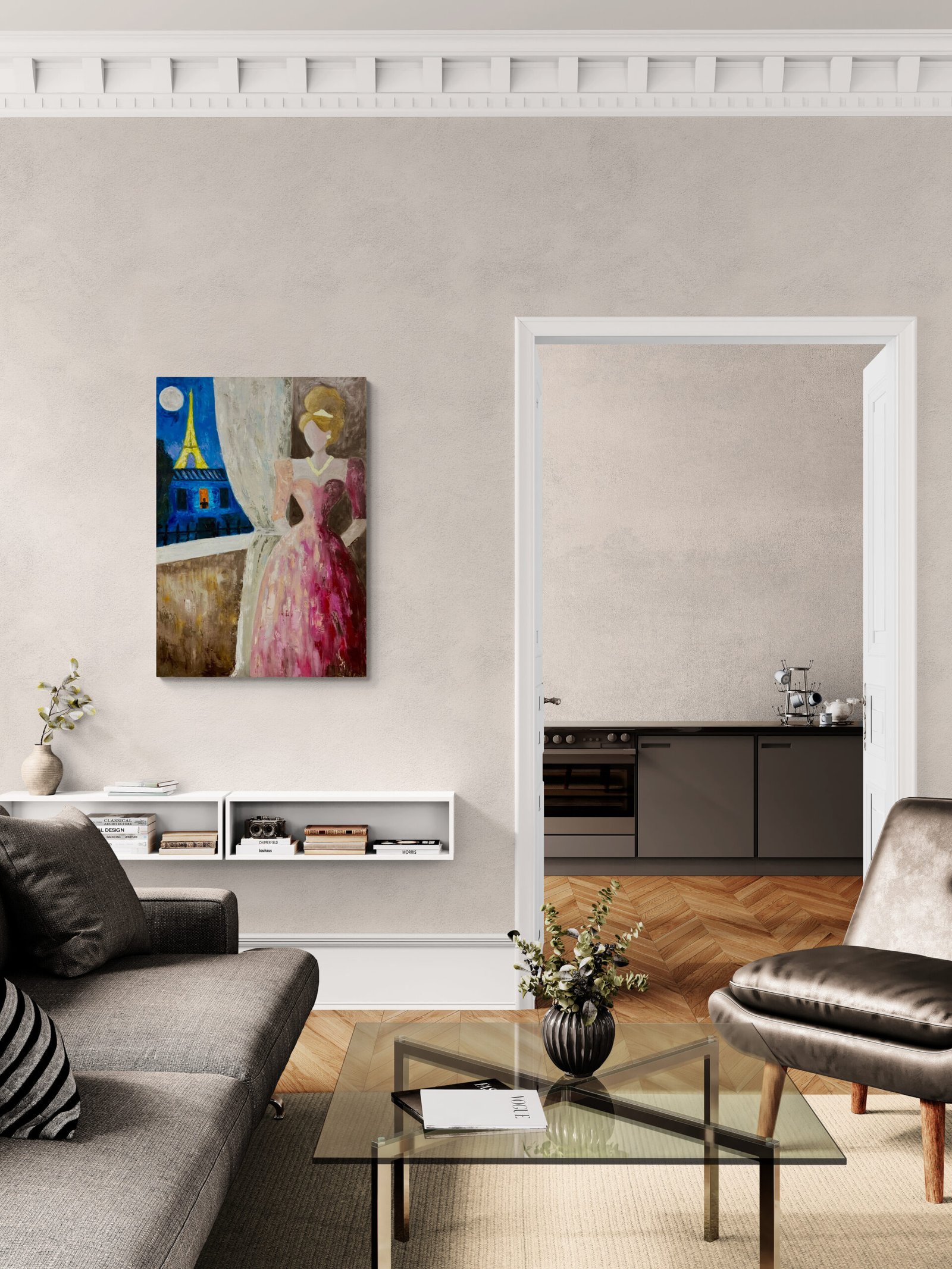 تُصوّر لوحة "ليالي باريس" امرأةً أنيقةً بلا ملامح تقف عند نافذة، تُحدّق في ليلةٍ باريسيةٍ مُقمرة. ترتدي ثوبًا ورديًا انسيابيًا غنيّ النسيج، مُرصّعًا بمجوهراتٍ ذهبيةٍ رقيقة، تُثير في النفس شعورًا بالرقيّ والغموض الخالدين. تُؤطّر طيّات الستارة الناعمة برج إيفل المُتوهّج وسماءً ليليةً زرقاءَ عميقة، حيث يُوحي مبنىً بعيدٌ بنافذةٍ مُضاءةٍ بدفءٍ بمشهدٍ حميمٍ يتكشّف. يُولّد التباين بين دفء الداخل والجو الخارجيّ الحالم شعورًا بالشوق والحنين والترقب، ما يدفع المُشاهد إلى التساؤل عن القصة الكامنة وراء نظرتها.