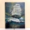 لوحة بحرية قوية لسفينة ضخمة تبحر في مياه عاصفة، تجسد المغامرة والمرونة.