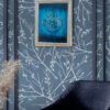 قطعة خطية مذهلة تضم اسم الله بالحبر الأسود على خلفية زرقاء متدرجة، محاطة بإطار فضي.