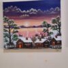 كابينات خشبية بجانب البحيرة عند شروق الشمس.