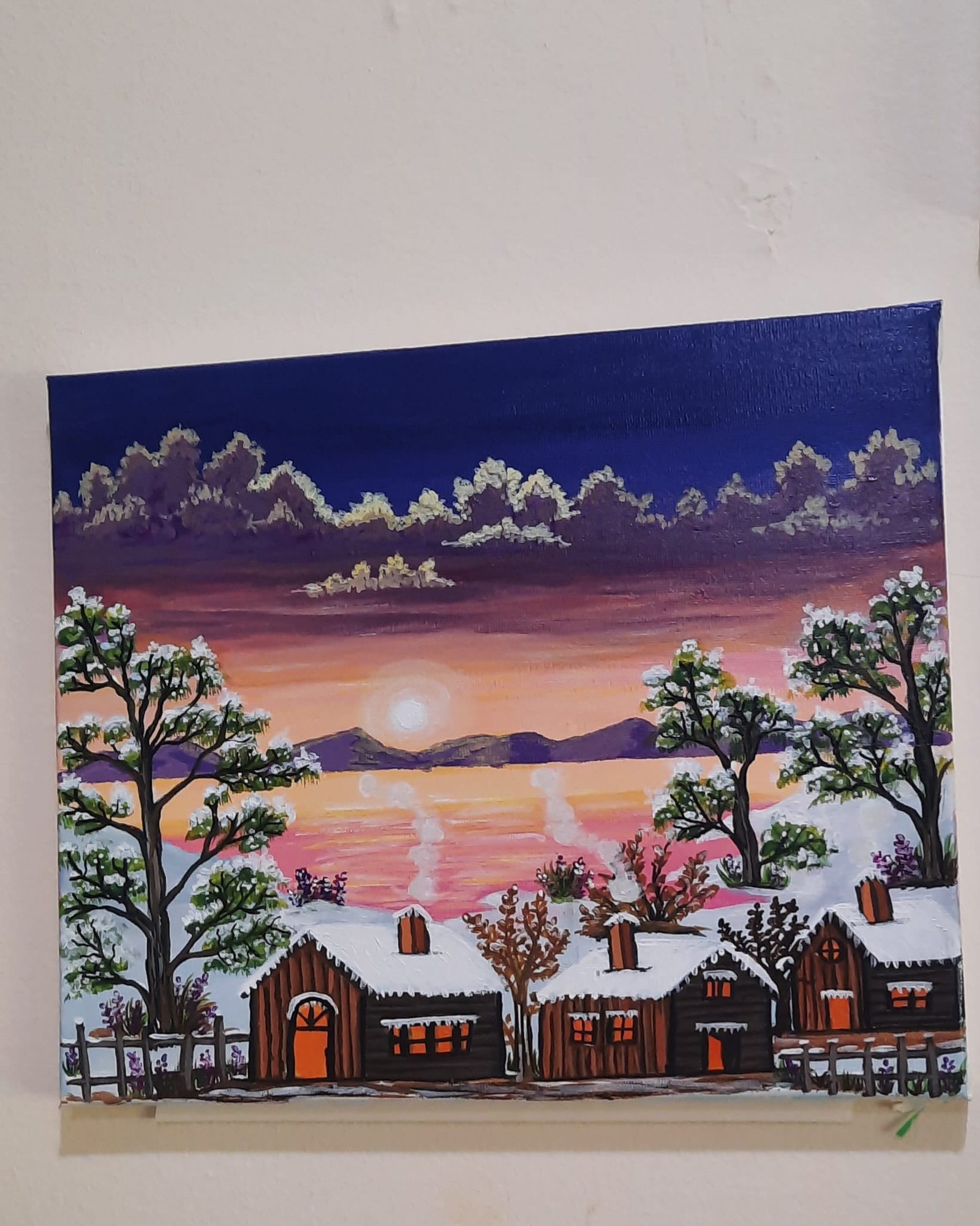 شروق شمس هادئ مُثلج، مع أكواخ صغيرة بجانب البحيرة. غيوم بعيدة وجبال مُتلألئة بأشعة الشمس. البحيرة تعكس جمال الطبيعة بهدوء.