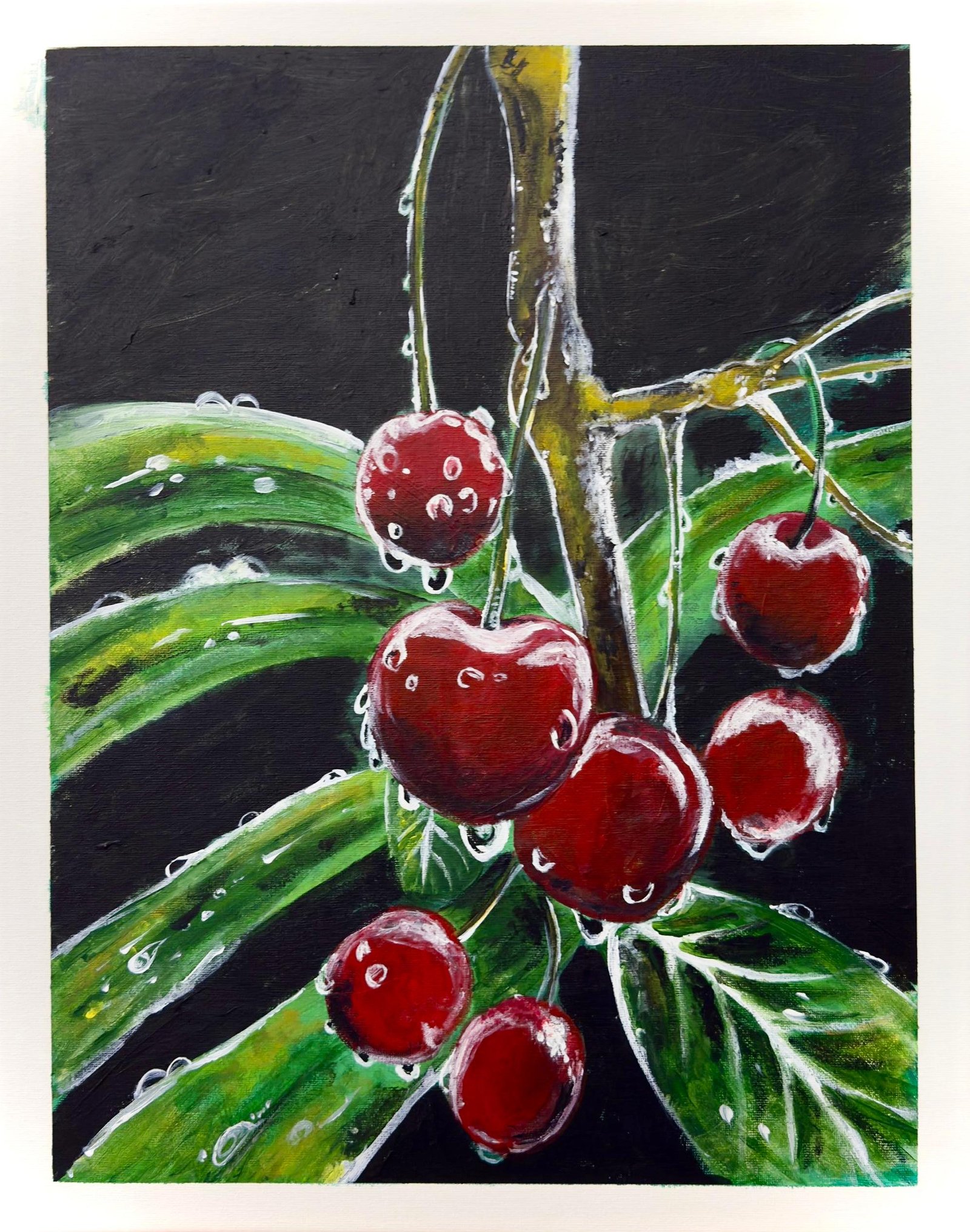 Realistic Acyrilic Painting of Bunch of Cherries after the rain..