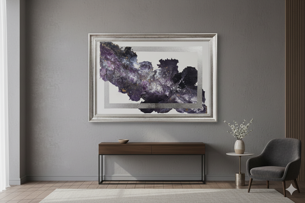 What makes this piece truly unique is the interaction with the silver border. Rather than staying confined within the inner rectangular frame, the “ink” or pigment appears to spill over the edges, breaking the fourth wall of the composition. This creates a powerful sense of freedom and depth, as if the art is too expansive to be contained.