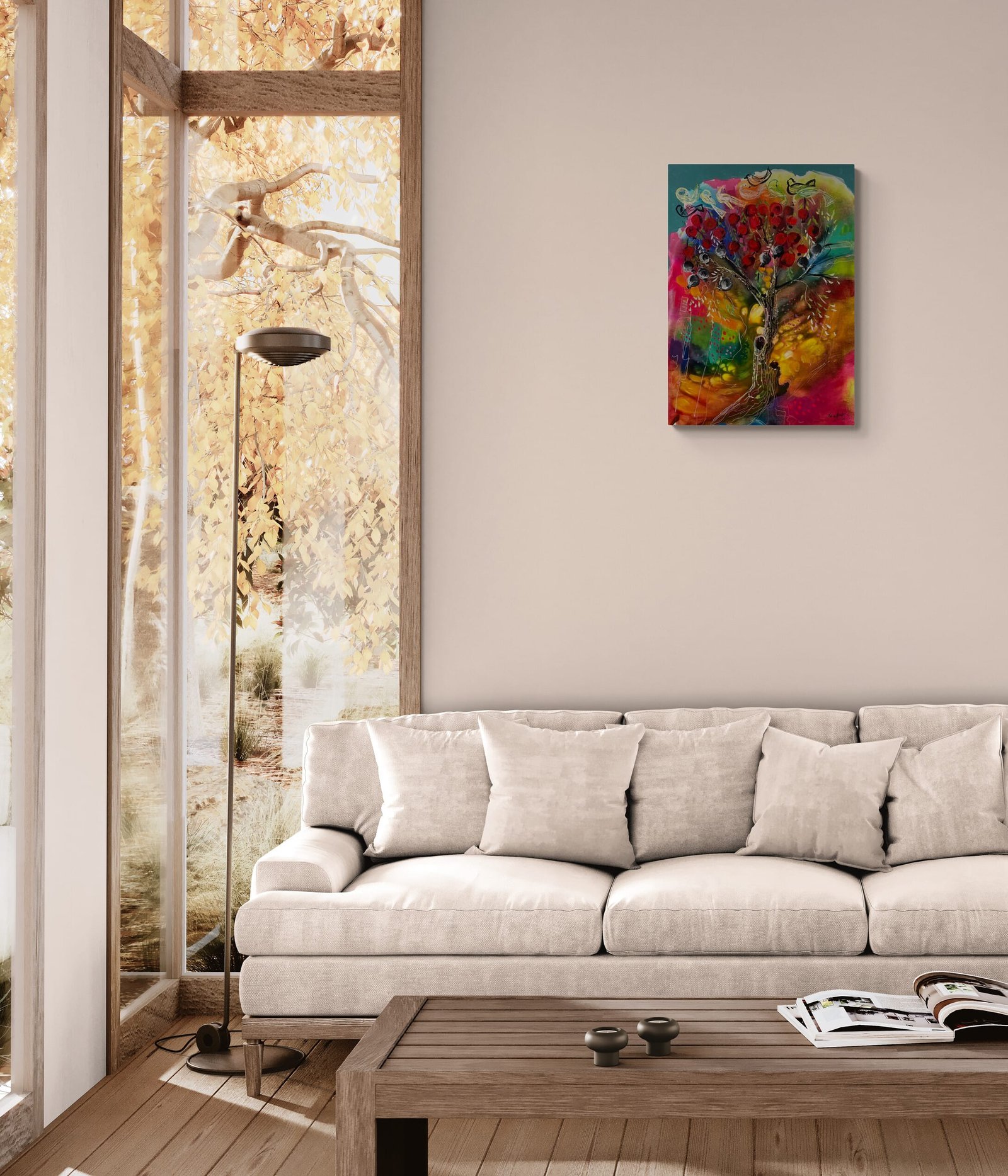 Bursting with vibrant colors and expressive details, this artwork presents a fantastical tree adorned with luscious red and black fruits, surrounded by delicate, dreamlike birds. The textured brushstrokes and layered hues create a dynamic sense of movement, evoking themes of abundance, growth, and harmony in nature. The rich blend of abstract elements and organic forms gives the painting a magical, almost surreal quality, inviting viewers into a world of imagination and wonder.
