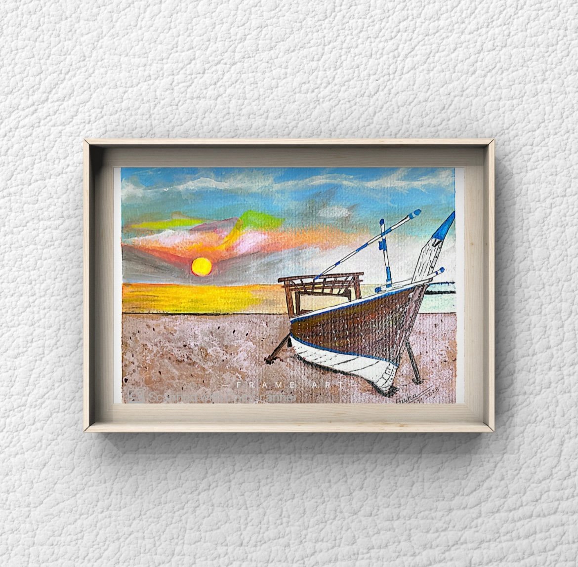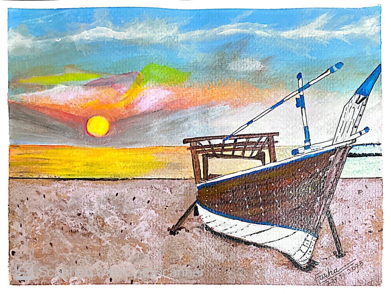 An acrylic painting of a qatari traditional dhow at seashore on paper (300 gsm).