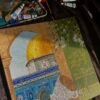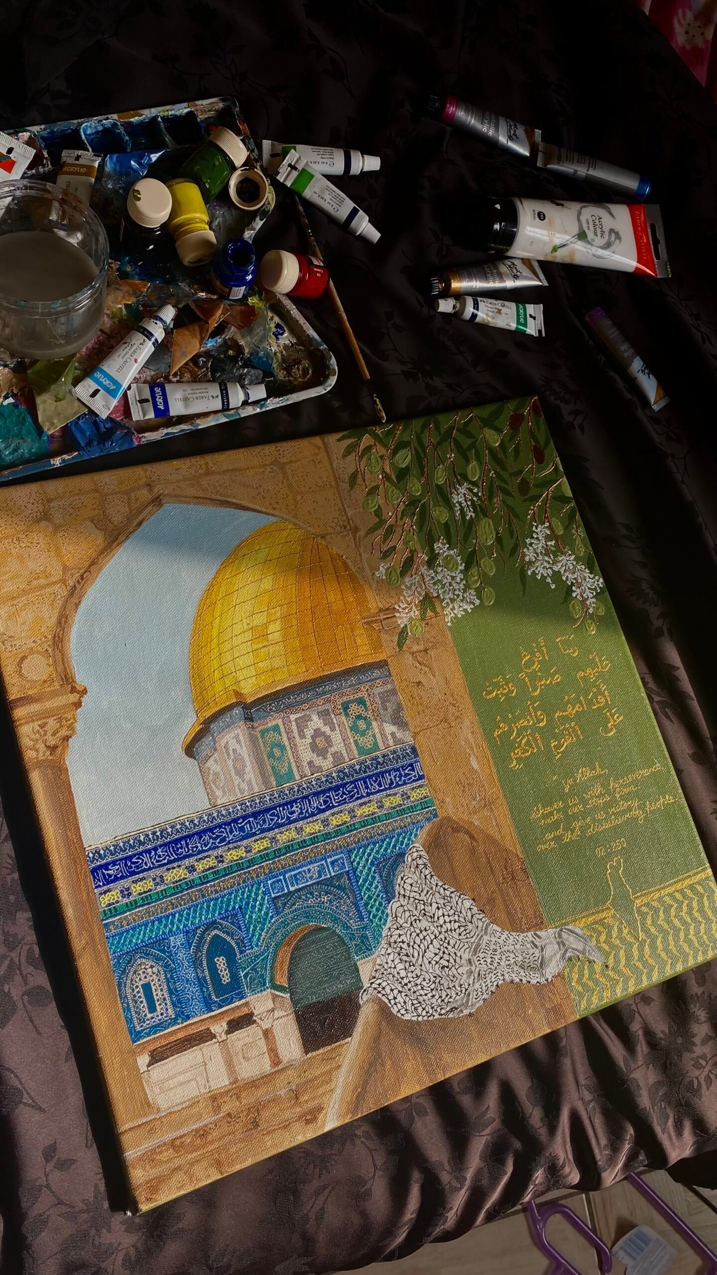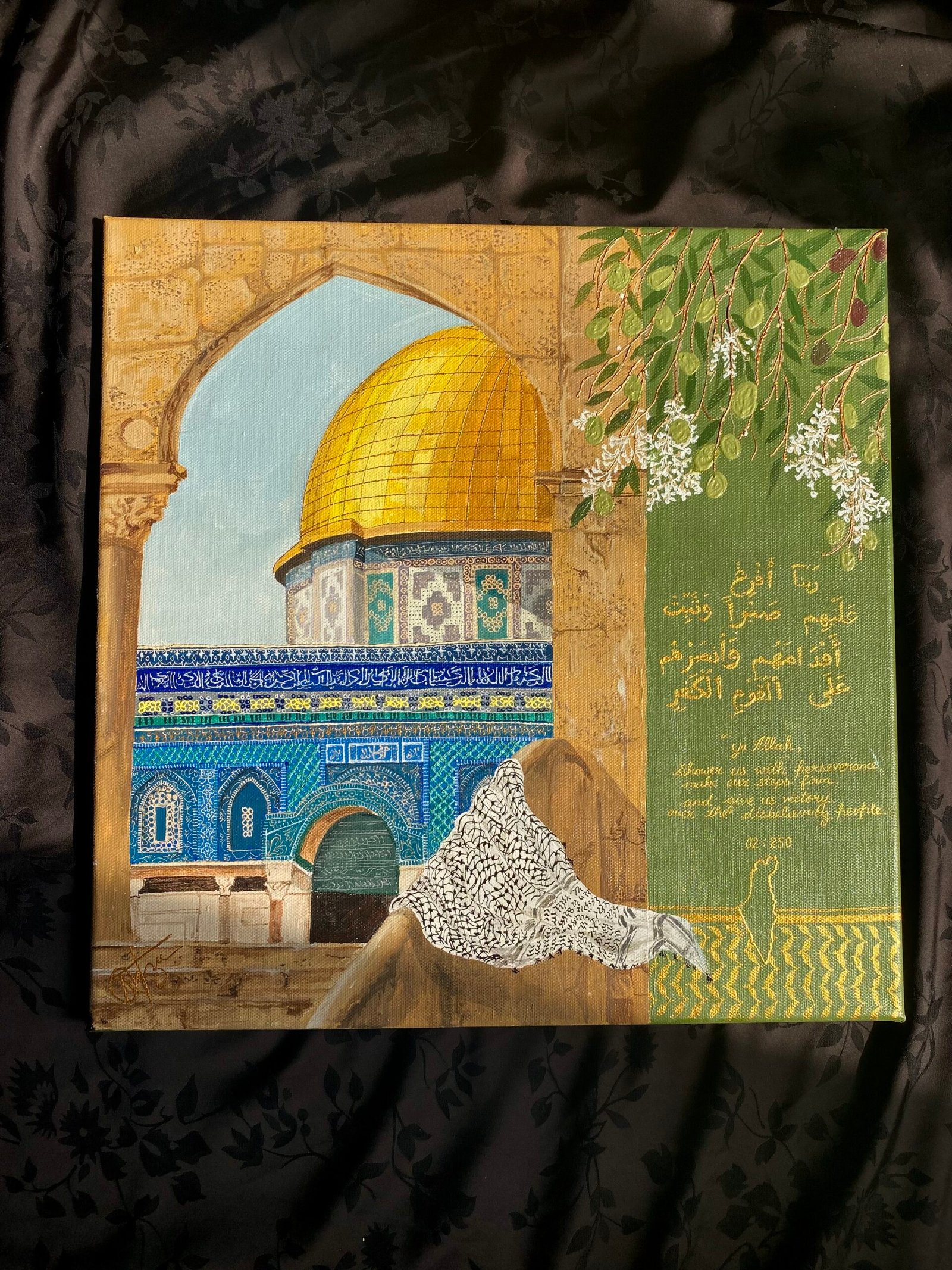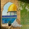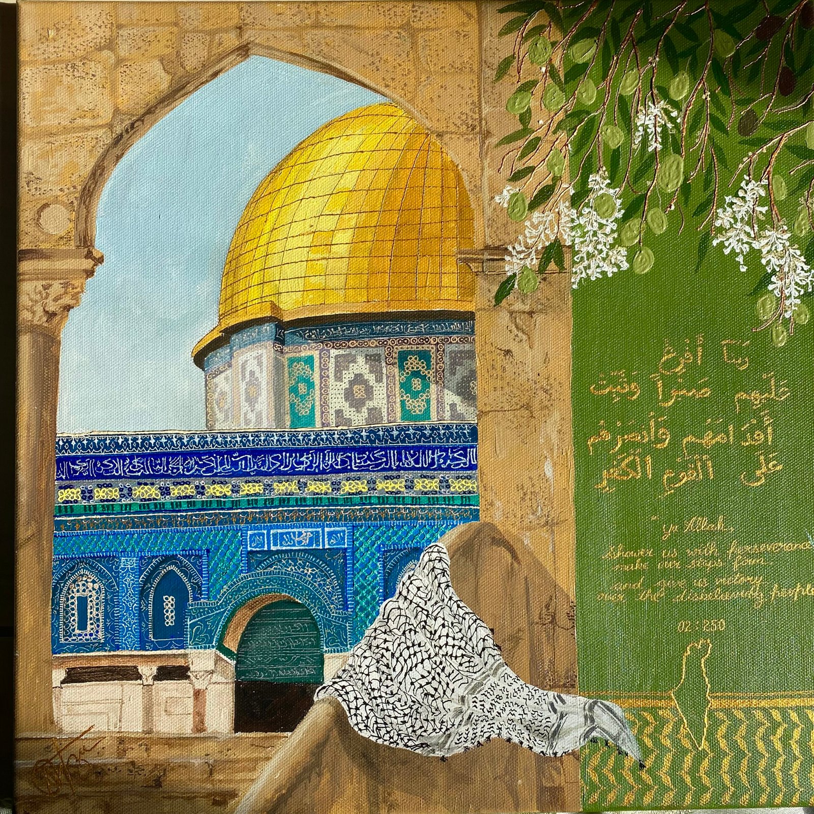 Palestine – Al-Aqsa Mosque is a heartfelt tribute to one of the most sacred and historically significant landmarks in the Islamic world. The golden Dome of the Rock shines brilliantly under a soft sky, its intricate blue mosaics rendered with loving detail. Framed by an archway and accompanied by cascading blossoms and delicate Arabic calligraphy, the piece becomes both a visual and spiritual journey. The artwork speaks to the enduring spirit of Palestine and the profound sanctity of Al-Aqsa Mosque.