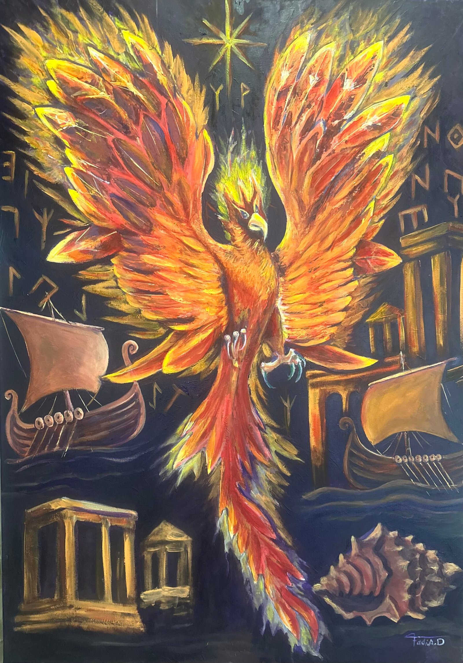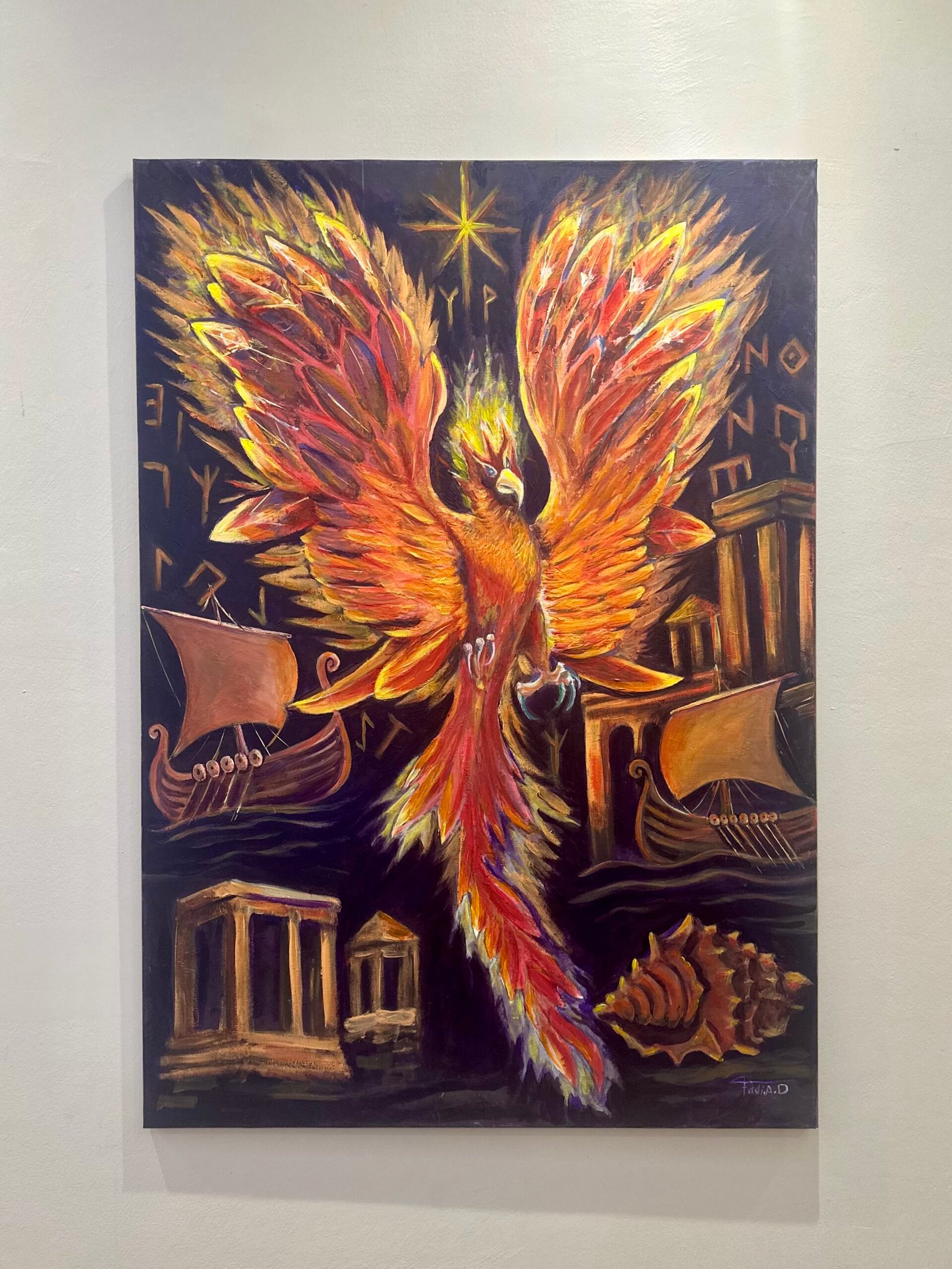 Capturing the mythical phoenix’s rebirth, “Immortal Blaze” is a powerful representation of renewal, with fiery wings that seem to burn off the canvas.