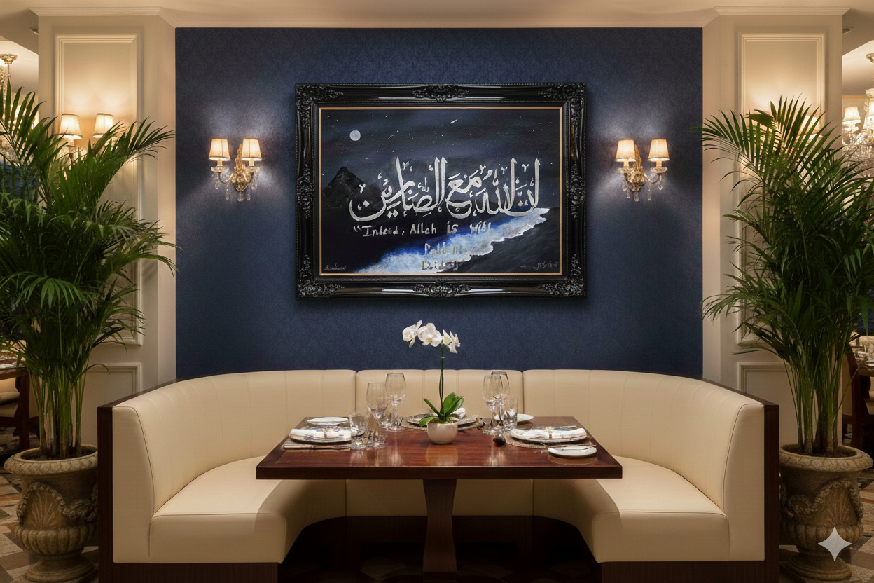 Silver Leaf Calligraphy: The centerpiece features the Quranic verse, “Indeed, Allah is with the patient” (2:153), rendered in striking silver leaf. The metallic sheen catches the light beautifully, symbolizing a beacon of hope in the darkness.
