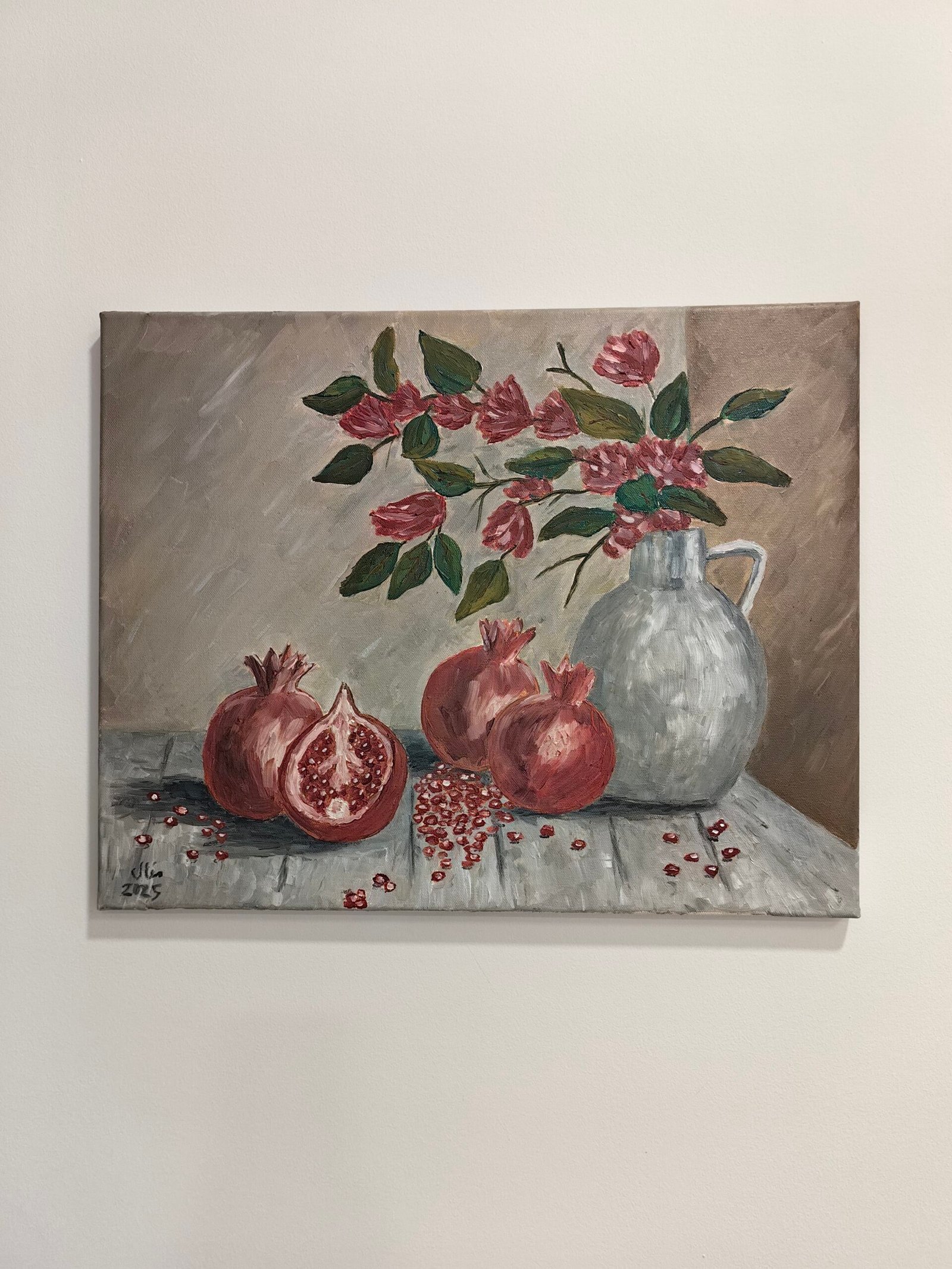 An oil painting that celebrates natural abundance through a still-life composition of ripe pomegranates beside a white ceramic jug filled with blooming pink flowers. The artist’s textured brushwork brings depth and richness to every seed and petal. Subtle light and muted tones create a calm, intimate mood. A harmonious balance of freshness and warmth evokes both vitality and serenity.