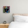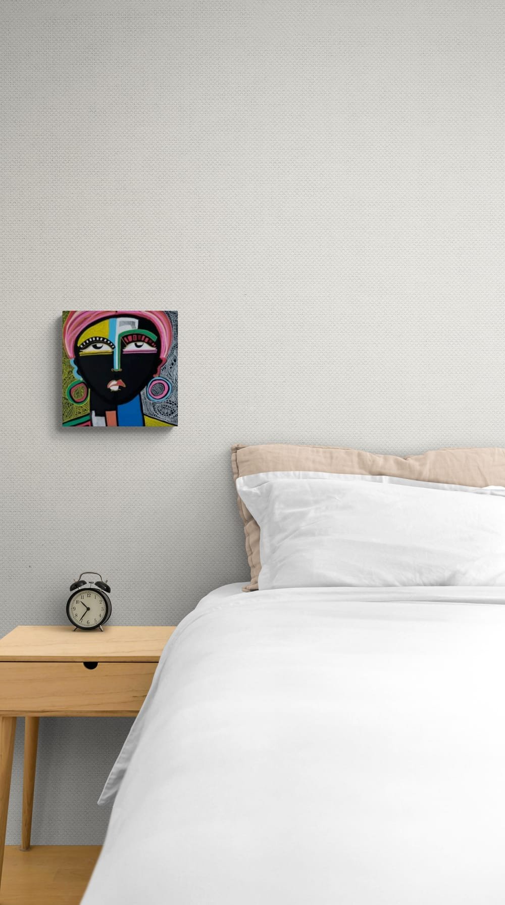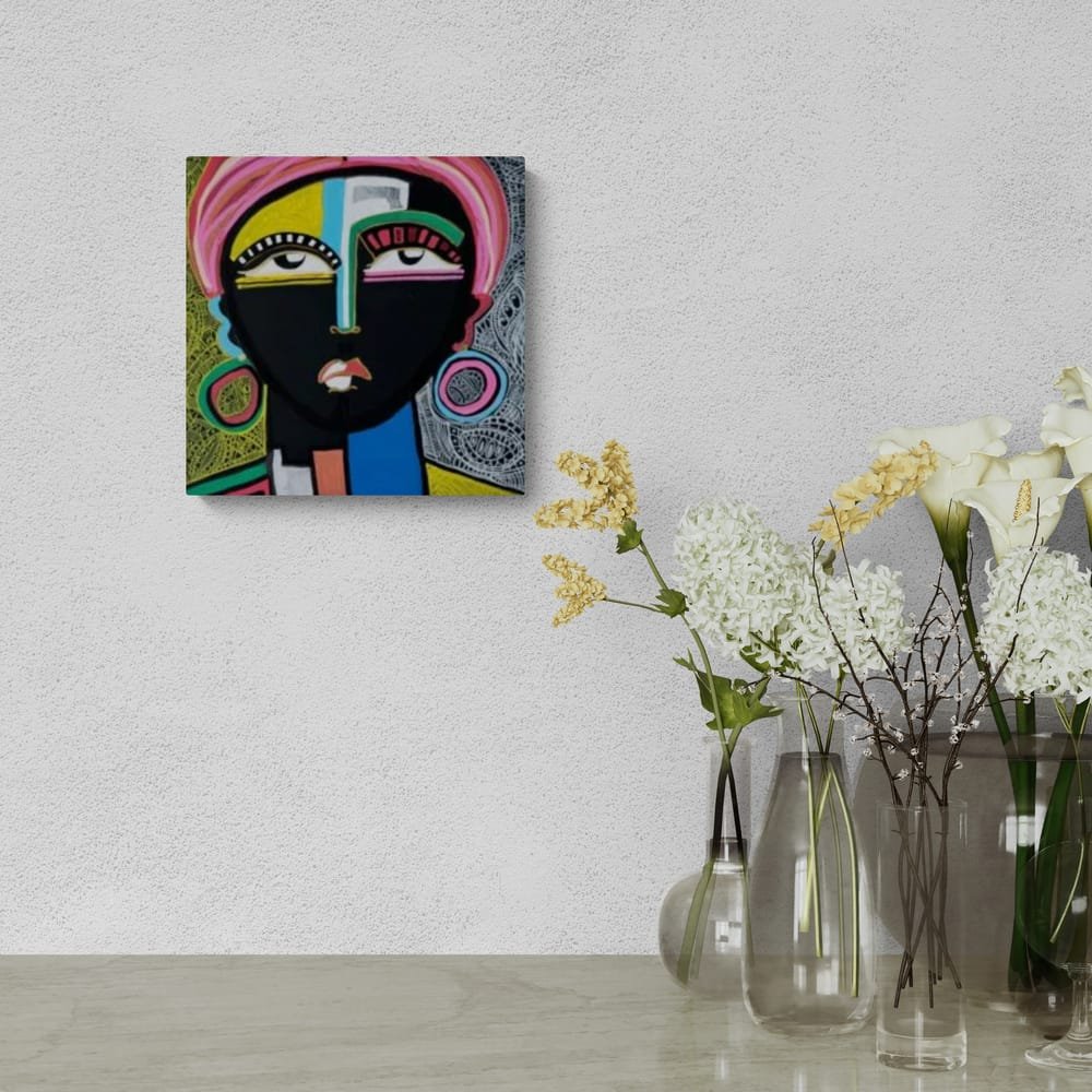 “The Muse” is a bold and captivating portrait that exudes vibrant energy and cultural richness. With striking geometric shapes and vivid colors, the figure’s face is divided into dynamic sections of pinks, blues, yellows, and greens, creating a visually arresting composition. The deep black skin tone is highlighted against the bright hues, making the face stand out with an intense gaze and expressive eyes. Large earrings and a headscarf add layers of cultural symbolism, representing the muse as a powerful and mysterious figure of inspiration. The intricate detailing and modern, abstract approach bring both complexity and elegance to this artwork, embodying strength, beauty, and creativity.