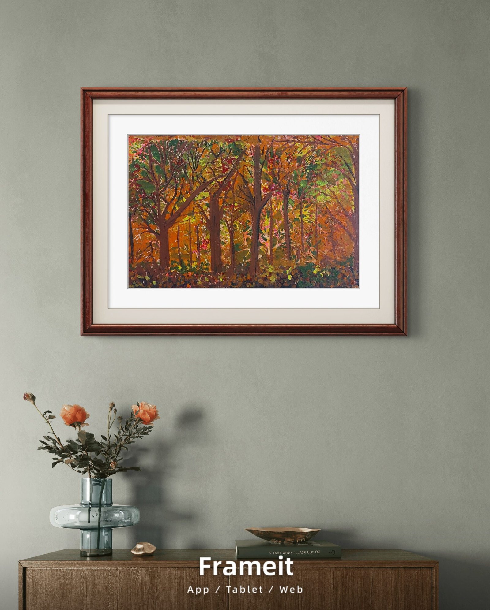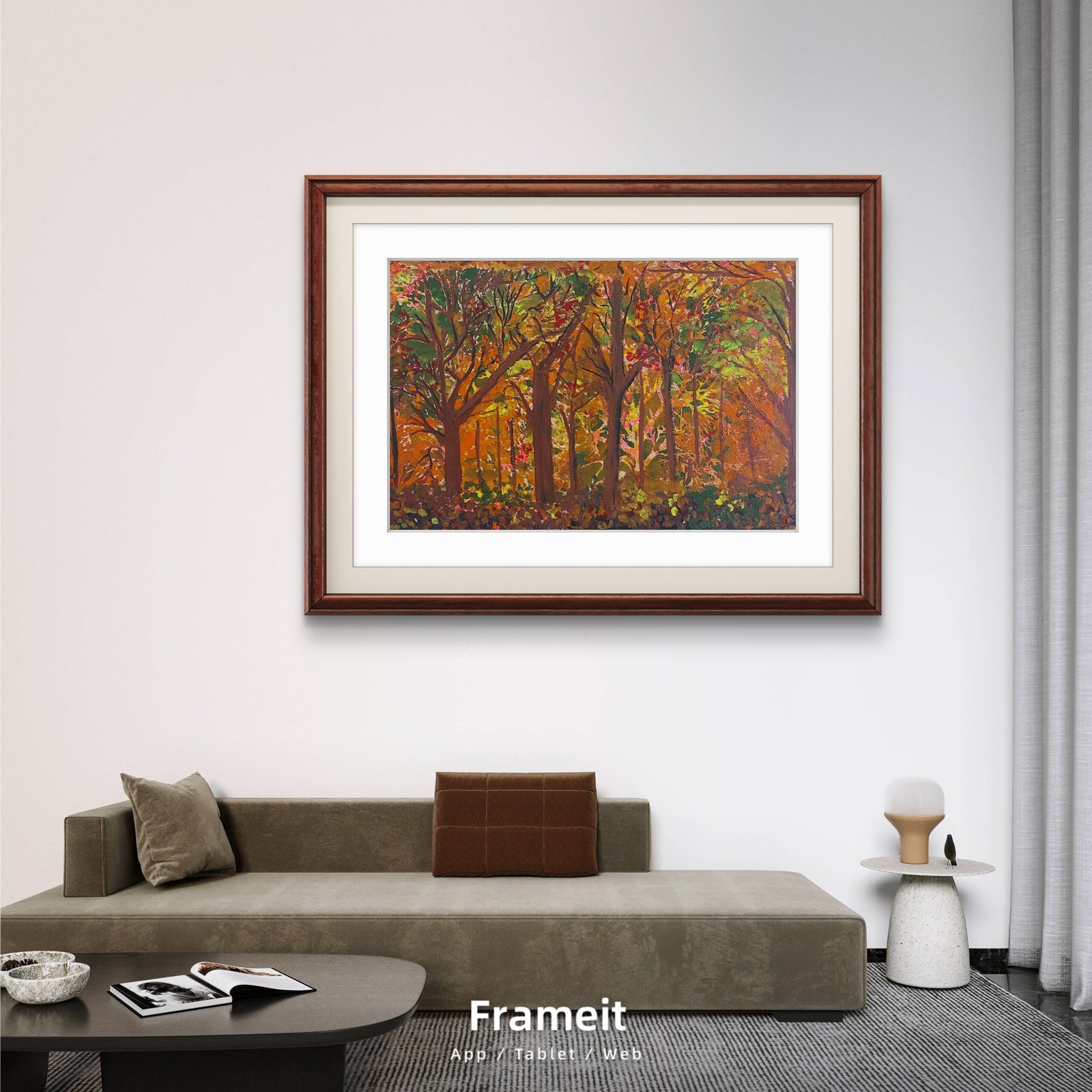 As you step into this dreamscape, the gentle rustle of leaves and soft filtering of sunlight through the canopy envelop you. Towering trees, adorned in vibrant oranges, yellows, and muted greens, stand as guardians of this quiet realm. The earthy scent of fallen leaves and the soft whisper of the wind create an immersive experience, inviting you to breathe in the stillness.