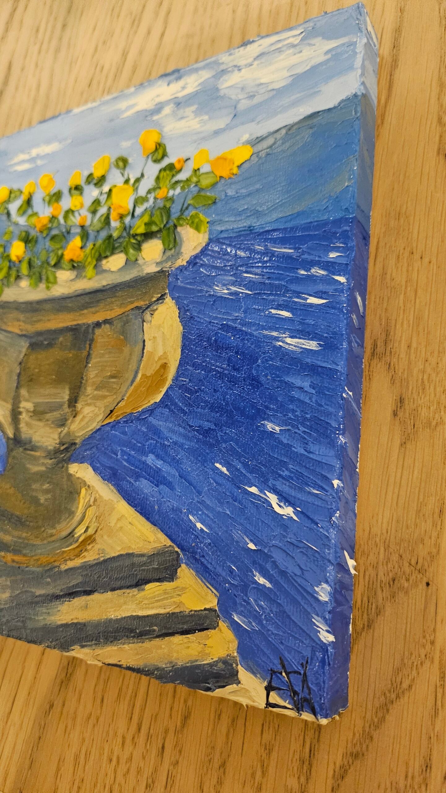 The play of light and shadow across layered colour creates both depth and movement, allowing the urn to emerge from the canvas in sculptural intensity. Amidst the solidity of the urn, the blooms soften the composition, symbolizing fragility within strength and the fleeting beauty of life held against a timeless vessel.